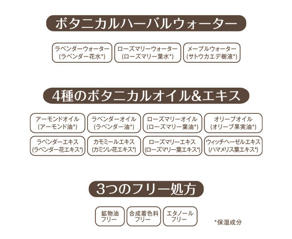 水、DPG、セタノール、トリ(カプリル酸/カプリン酸)グリセリル、ステアリン酸PEG-55、アーモンド殻粒、香料、ラベンダー花水、ローズマリー葉水、サトウカエデ樹液、シラカンバ樹液、アーモンド油、アルガニアスピノサ核油、オリーブ果実油、ラベンダー油、ローズマリー葉油、ハマメリス葉エキス、カミツレ花エキス、ラベンダー花エキス、ローズマリー葉エキス、ステアリン酸グリセリル、グリコシルトレハロース、加水分解水添デンプン、カルボマー、水酸化K、ヒドロキシエチルセルロース、BG、ペンチレングリコール、メチルパラベン、フェノキシエタノール